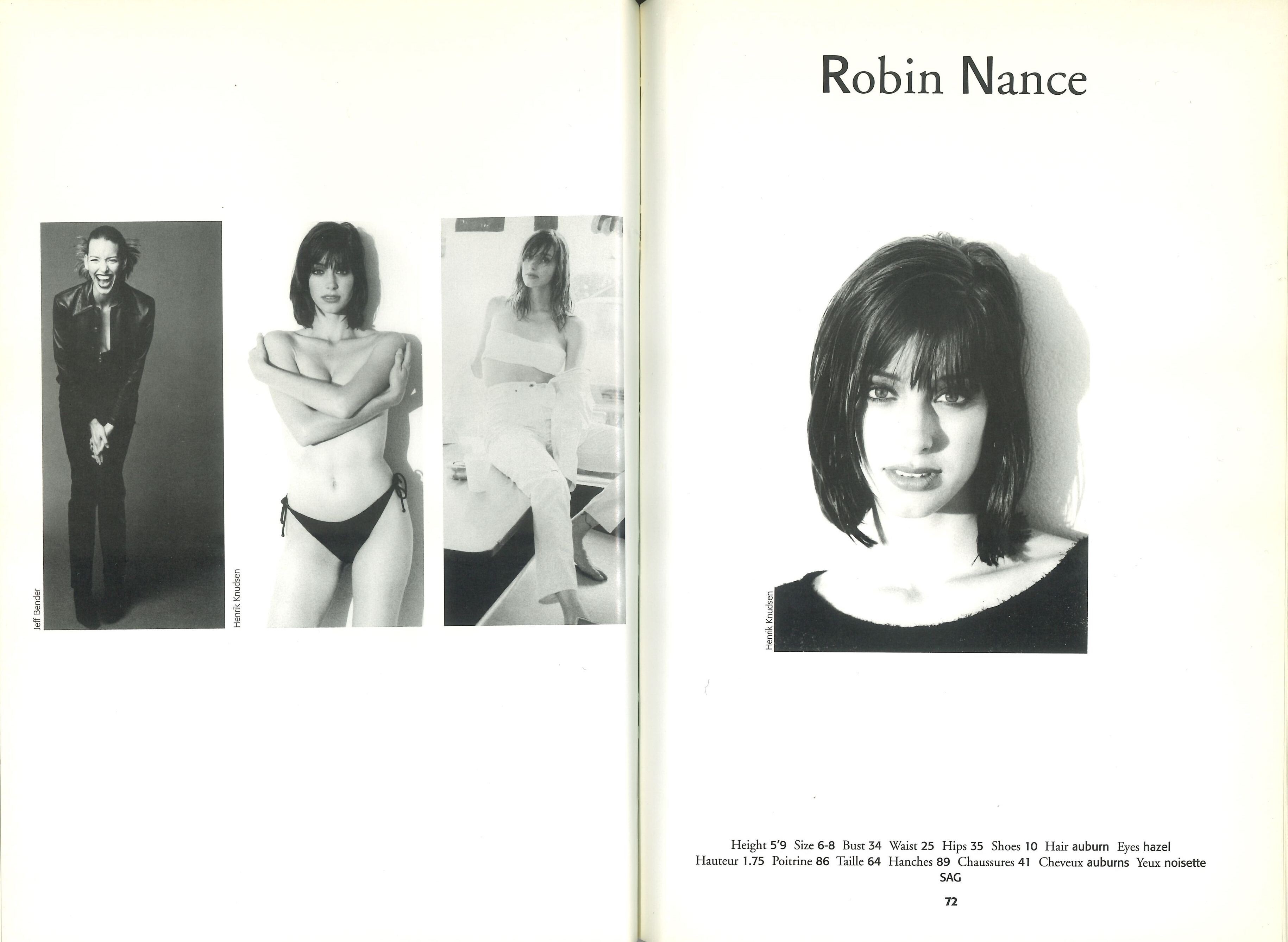 ROBIN NANCE Robin Jessica Nance (born in Augusta, Georgia on Nov.30, 1971) is a former US American model that was active from approximately 1991-2000. Height: 1,75m / 5‘9 Hair: brown or auburn Eyes: hazel Former Agencies: Elite Atlanta (motheragency) Elite L.A. Model Management Hamburg In 1996 Robin was married to Stephen B. Watson - as a result she is sometimes referred to as Robin Watson. Robin seems to work as a photographer nowadays. (Elite L.A. agency book 1997 / my scan)