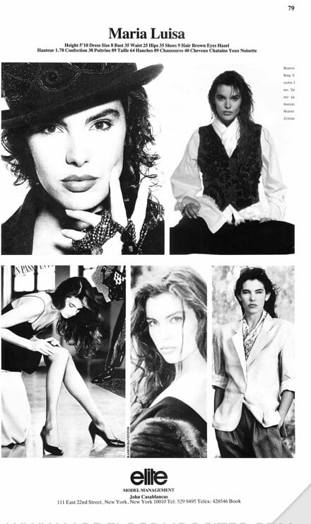 Maria Luisa is an 80s/90s model, represented by Elite. Height: 1.78 Bust: 89 Waist: 64 Hips: 89 Shoes: 40 Hair: Brown Eyes: Hazel