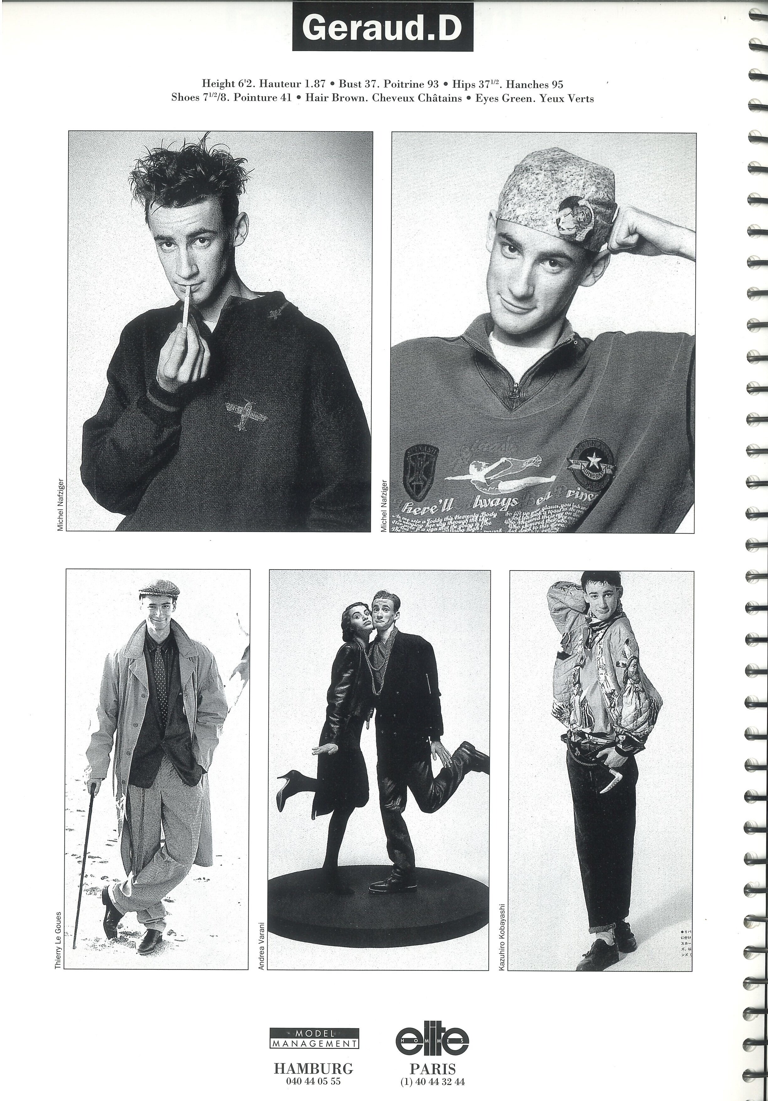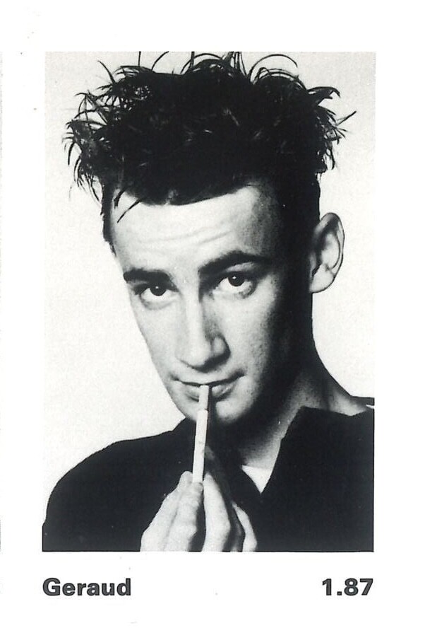 GERAUD D. Geraud D. used to be a French male model that was active during the mid 1980s until the early 1990s. His full family name is unfortunately not known. With his quirky looks he worked quite extensively for high end editorial clients but also did many advertising campaigns outside of fashion. Height: 1,87m / 6‘2 Hair: brown Eyes: green Former Agencies: Elite Paris (motheragency) Model Management Hamburg (Elite Europe agency book 1991 & Model Management Hamburg headsheet poster 1991 / my scans)