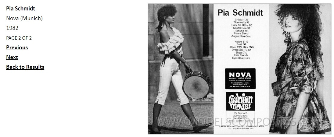 Pia Schmidt is an 80s/90s model. She is currently still active through Sweden Models Agency. Height: 1.78 Bust: 91 Waist: 59 Hips: 90 Shoes: 40 Hair: Blonde Eyes: Blue-Grey modelcomposites.com