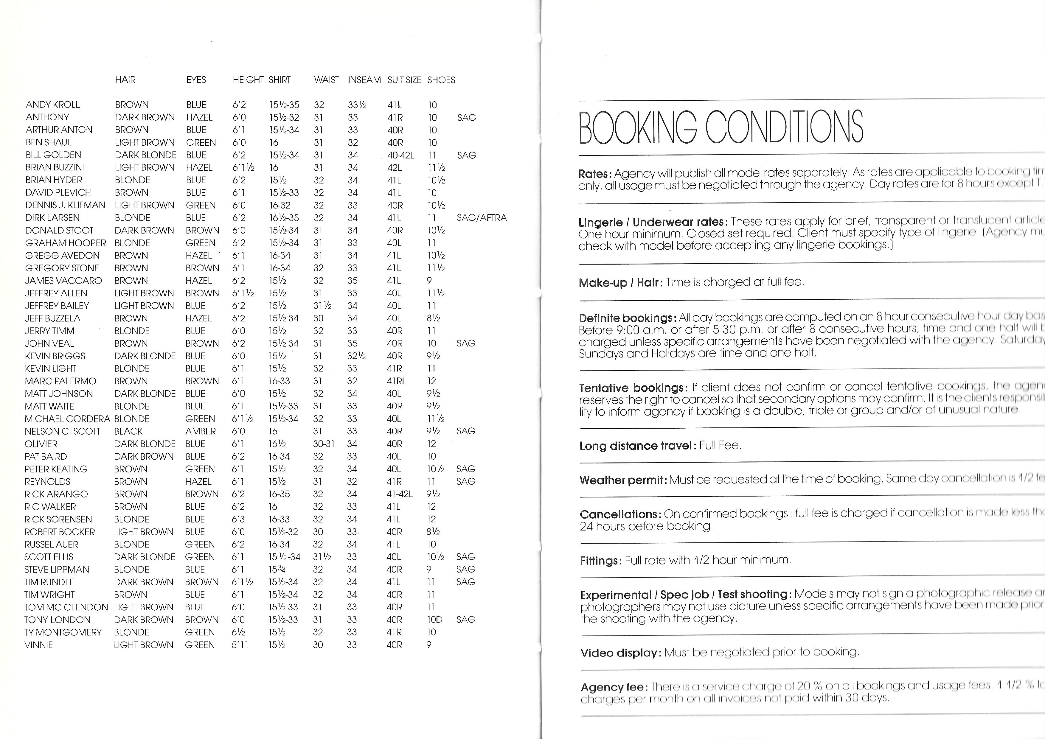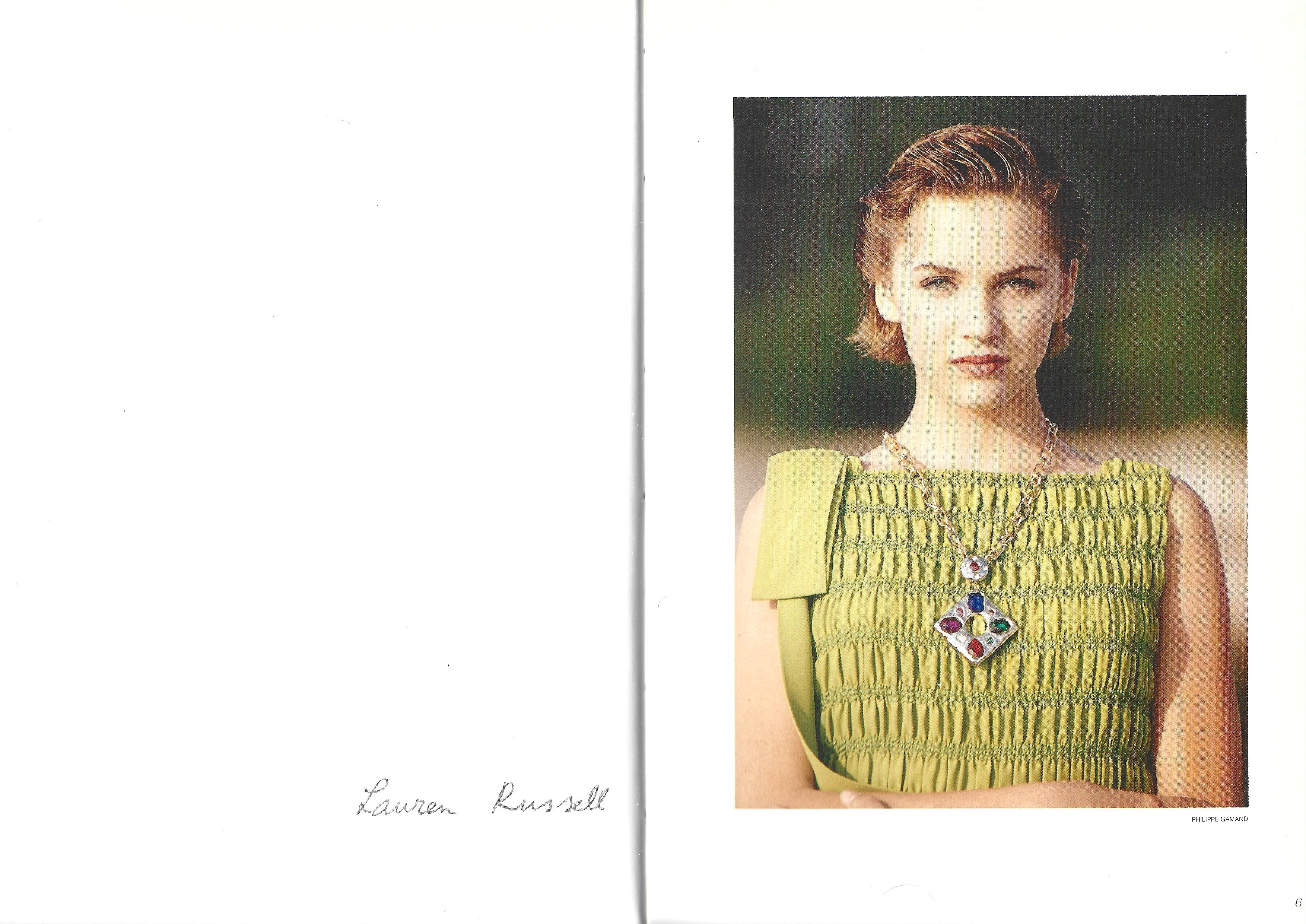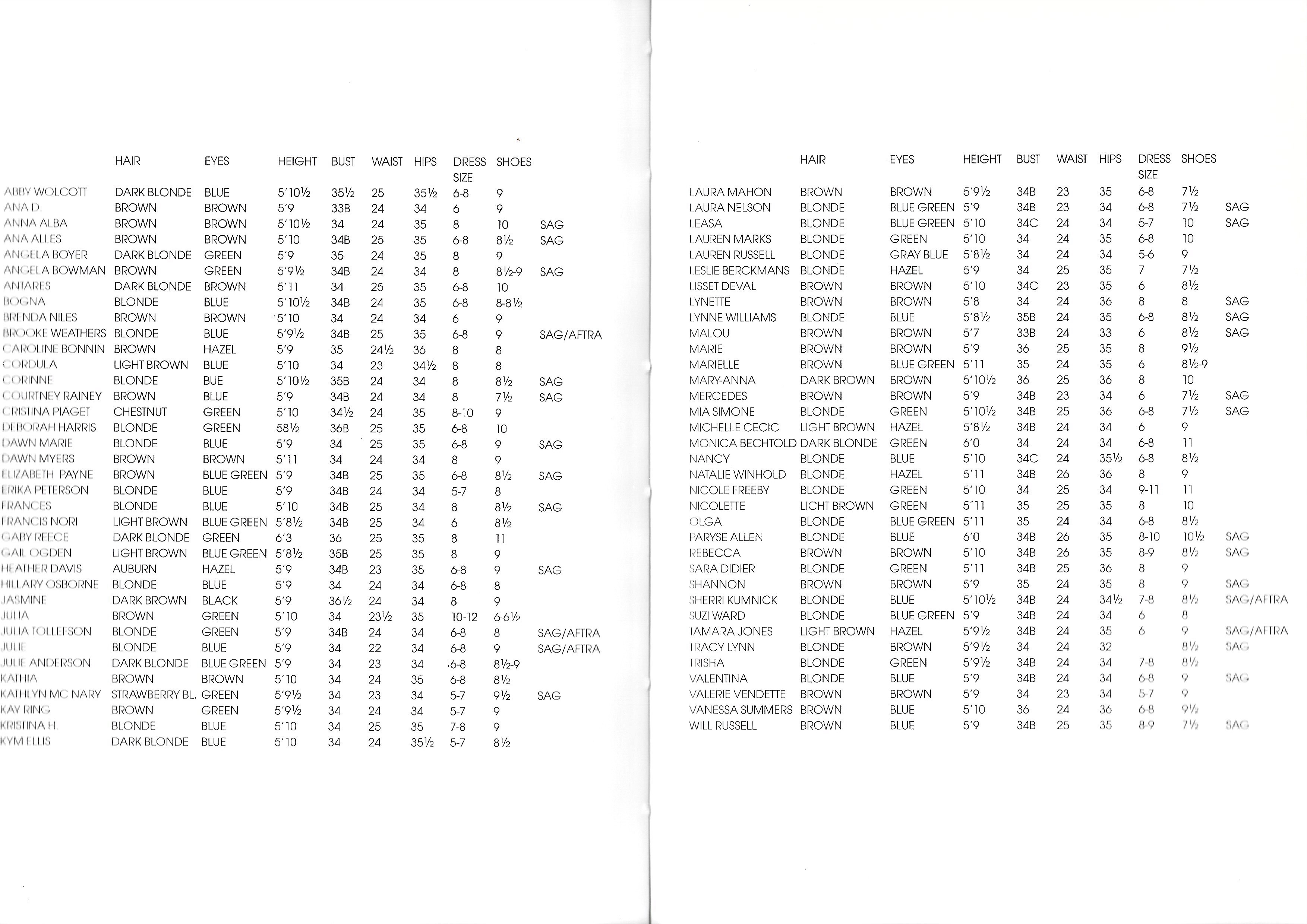Michele Pommier Miami 1991: Index: Women: Kay Ring Antares Kathlyn McNary Lauren Macks Marie Lauren Russell Christy Turlington Tamara Jones Brooke Weathers Leslie Berckmans Lynette Hillary Osborne Valerie Vendette Cristina Piaget Suzi Ward Laura Nelson Vanessa Summers Deborah Harris Mary-Anna Kym Ellis Dawn Marie Malou Kathia Paryse Allen Nicole Freeby Sara Didier Caroline Bonin Julie Anderson Michelle Cecie Sherri Kumnick Tracy Lynne Monica Bechtold Kristina H. Mia Simone Gail Ogden Bogna Ana D. Jasmine Trisha Leasa Anna Alba Laura Mahon Brenda Niles Marielle Macville Shannon Julie Courtney Rainey Erika Peterson Gaby Reece aka Gabrielle Reece Nancy Mercedes Will Russell Olga Frances Abby Wolcott aka Abigail Wolcott Angela Boyer Heather Davis Angela Bowman Lynne Williams Rebecca Natalie Winhold Lisset Deval Valentina Corinne Cordula Reyer Francis Nori Dawn Myers Julia Julia Tollefson Nicolette Ana Alles Elizabeth Payne Men: Gregory Stone Arthur Anton James Vaccaro Jeffrey Bailey Jerry Timm Reynolds Matt Waite Rick Arango Tim Rundle Dennis J. Klifman Graham Hooper Jeffrey Allen Brian Buzzini Steve Lippman Donald Stoot Russel Auer Rick Sorensen Robert Bocker Dirk Larsen Pat Baird Scott Ellis Ben Shaul Bill Golden Ty Montgomery Marc Palermo Kevin Briggs Tim Wright Peter Keating Kevin Light John Veal Brian Hyder Nelson C. Scott David Plevich Andy Kroll Ric Walker Anthony Tony London Tom McClendon Jeff Buzzela Gregg Avedon Vinnie Michael Cordera Olivier Matt Johnson Measurements: (my scans - unfortunately not easy to scan since some pictures are printed on transparent parchment papers)
