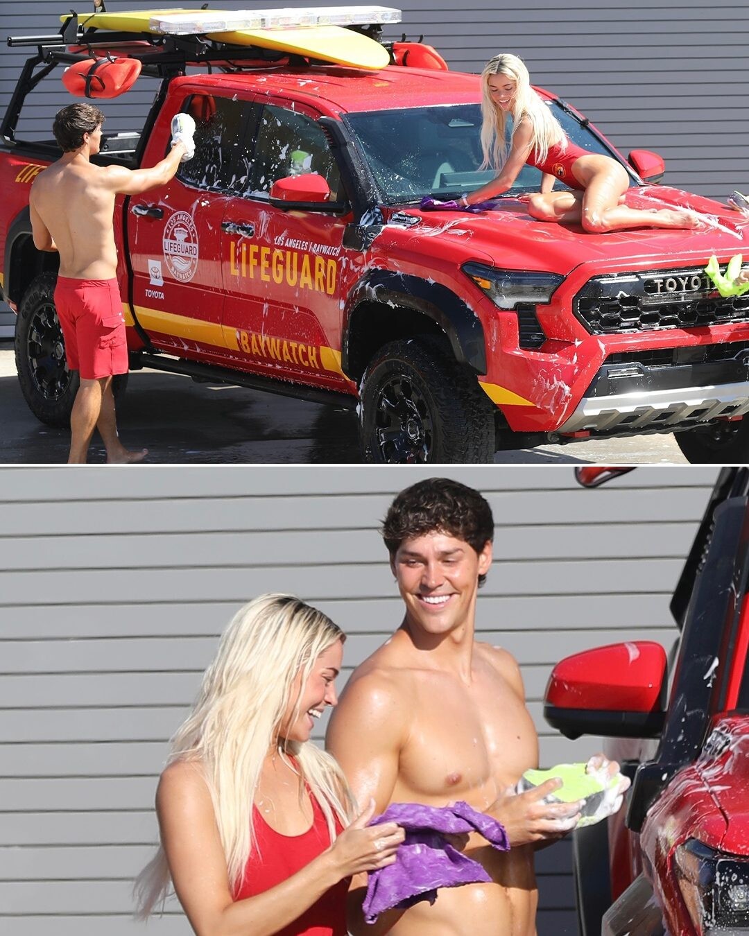 People: Baywatch is back. 🌊🏄♀️ Livvy Dunne, Brooks Nader, Noah Beck, and Shay Mitchell are among the stars who have been spotted filming for the upcoming Fox reboot series — and from a soapy car wash to those iconic red swimsuits, things are already heating up! Will you be watching? 👀