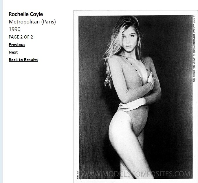 Rochelle Coyle is an 80s/90s model, represented by Metropolitan, Paris. Height: 1.76 Bust: 85 Waist: 62 Hips: 89 Shoes: 40 Hair: Blonde Eyes: Grey-Green modelcomposites.com