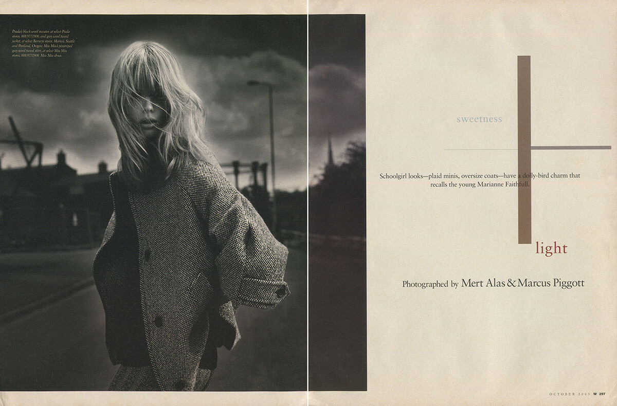 W Magazine October 2003 "Sweetness and Light" Model: Julia Stegner Photographers: Mert Alas & Marcus Piggott Stylist: Joe McKenna Hair: Luigi Murenu Makeup: Charlotte Tilbury Manicure: Lorraine Griffin radolgc.weebly.com