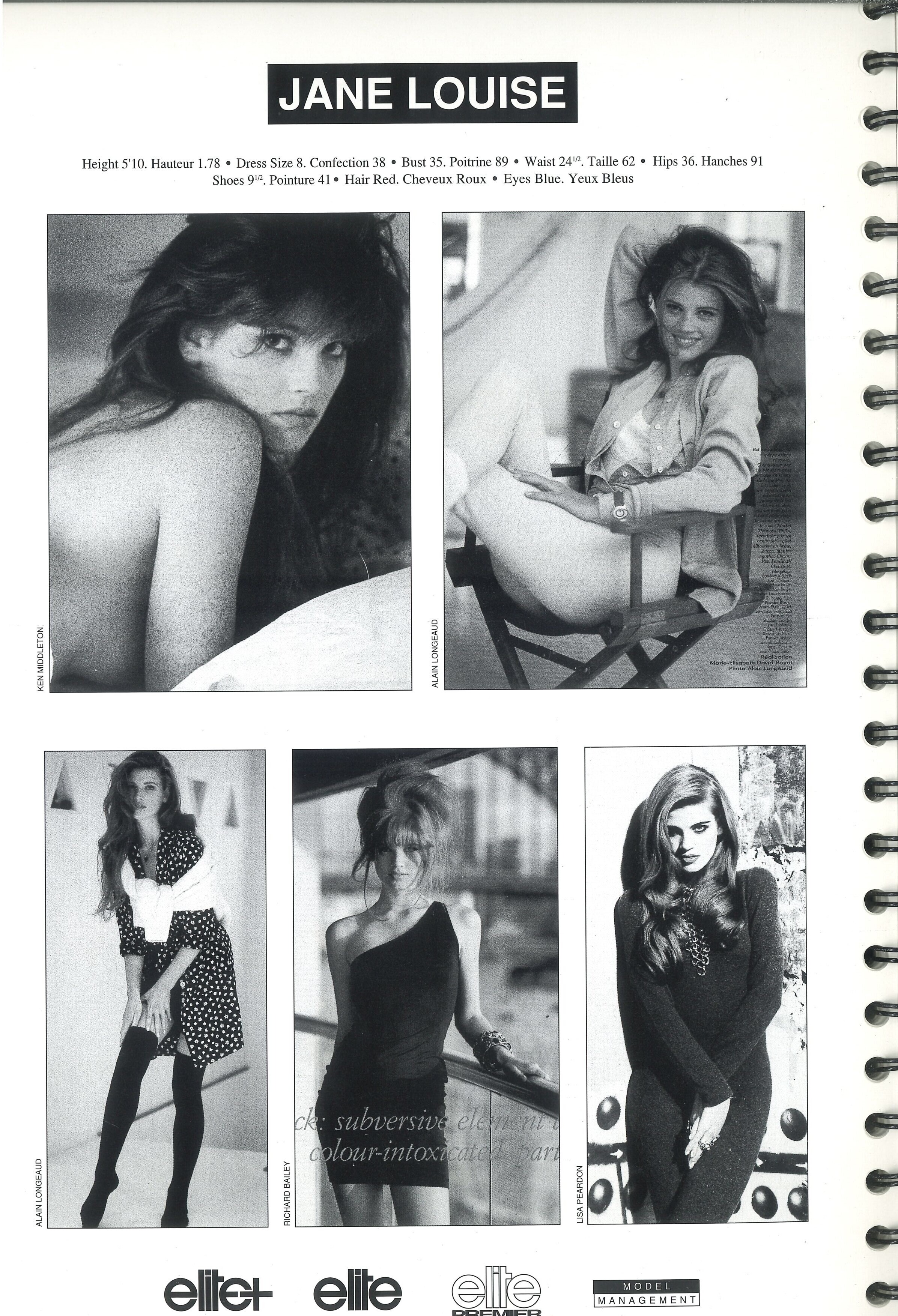 JANE LOUISE MCGUINNESS Jane Louise McGuinness is a former Australian model from Sydney that was active in the very late 1980s into the 1990s. She was represented inside the Elite network and it’s affiliated agencies. Height: 1,78m / 5‘10 Hair: red Eyes: blue (Elite Europe agency books 1991 & 1993 / my scans) Former Agencies: Priscilla“s Sydney (motheragency?) Elite Paris Elite Milan Elite Premier London Model Management Hamburg Munich Models- Clara Veiga Gazinelli