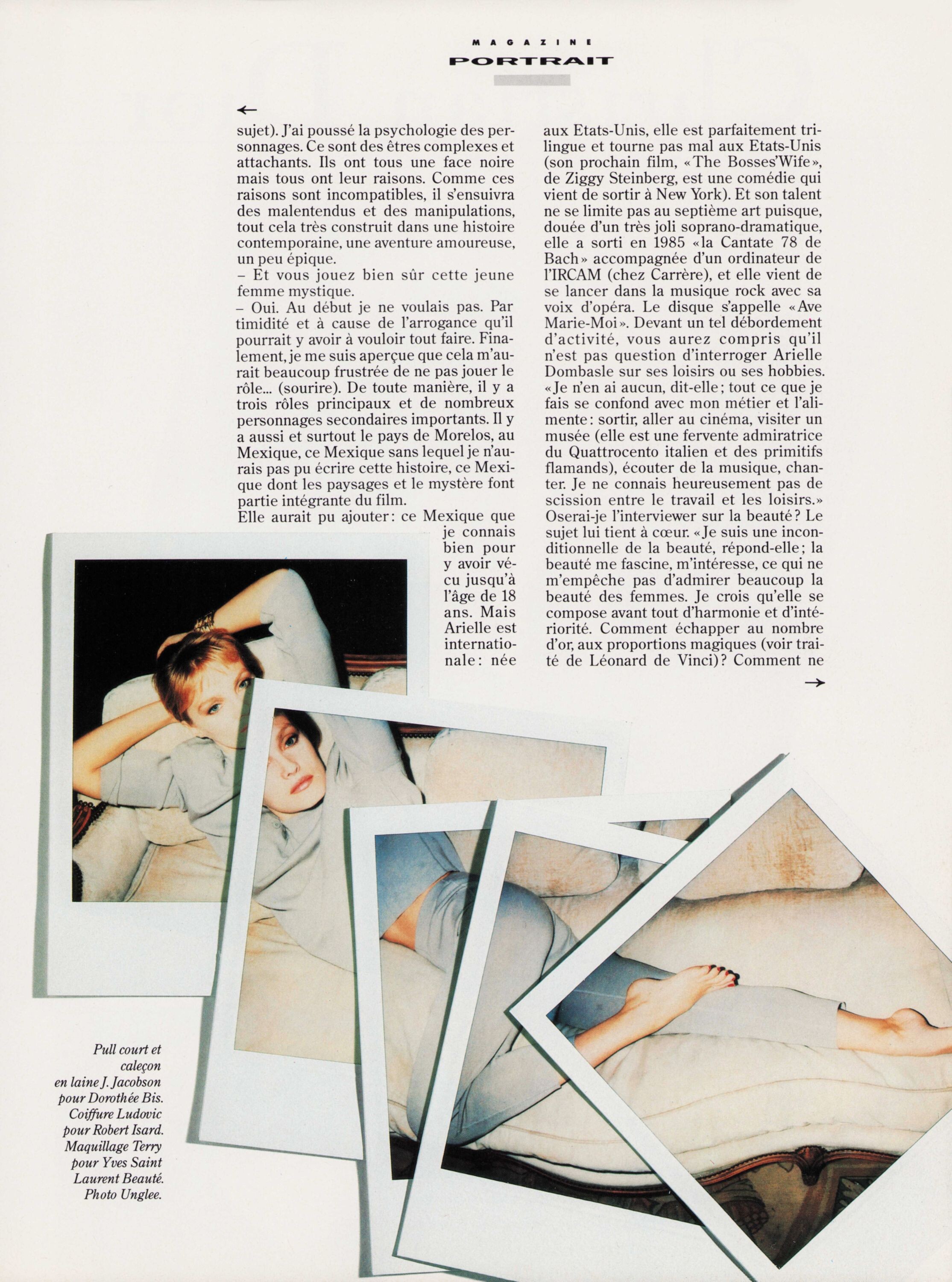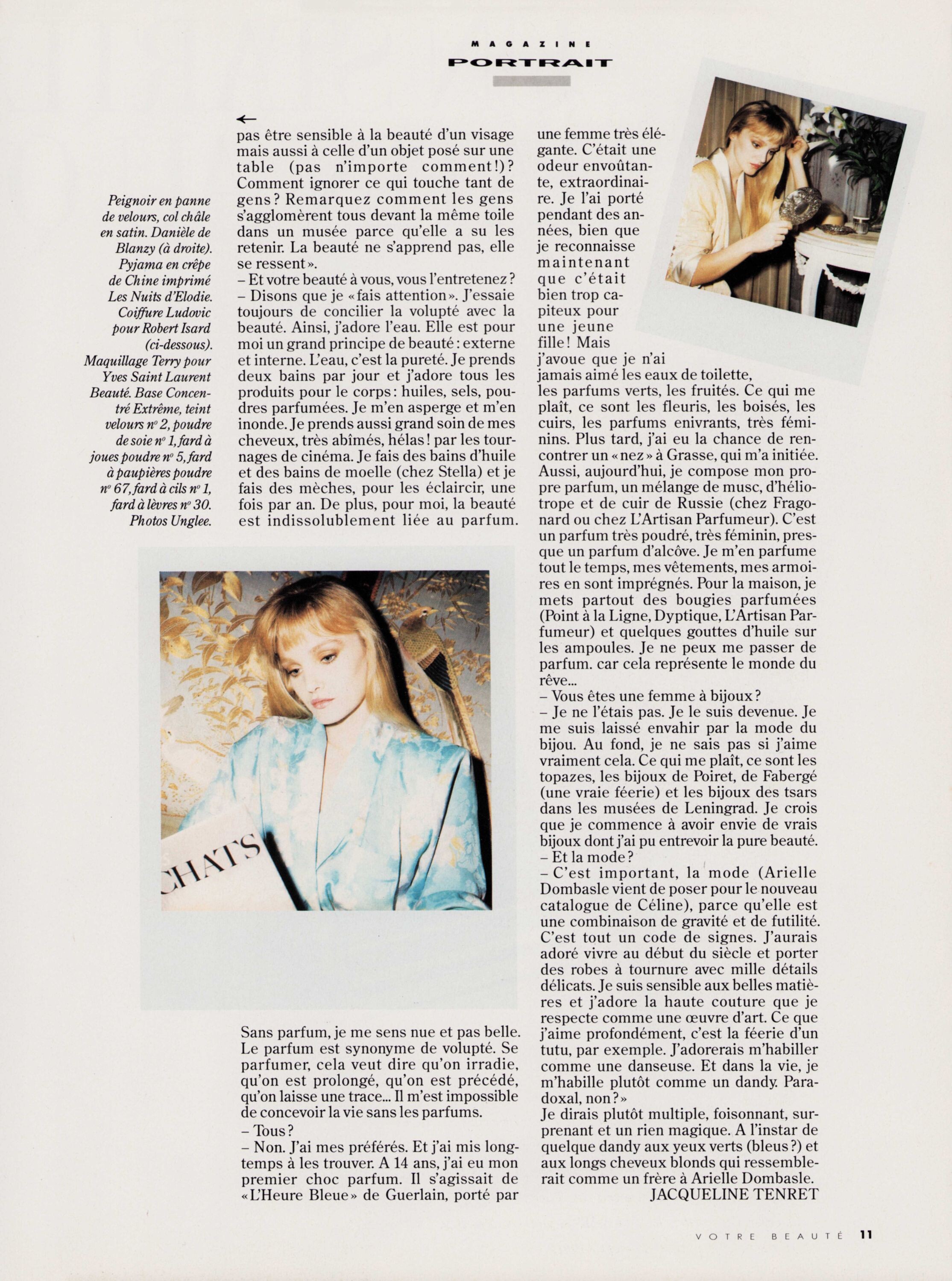Votre Beaute February 1987 Arielle Dombasle: "la beaute ne s'apprend pas, elle se ressent" Photographer: Frank Horvat Celine magazine S/S 1987 preview my scans