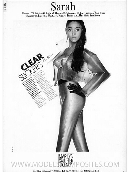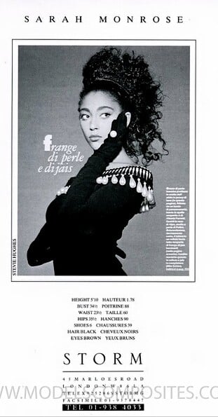 Sarah Monrose is an 80s/90s model, represented by Marilyn and Storm Models. She is currently still a model, she also does photography. https://elliottbrownagency.co.uk/talent/sarah-monrose/ https://www.instagram.com/sarahmonrose.photography/?hl=en Height: 1.78 Bust: 88 Waist: 60 Hips: 90 Shoes: 39 Hair: Black Eyes: Brown modelcomposites.com