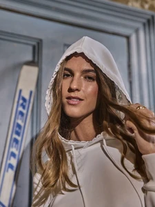 Aralina Ski Season Leisurewear Fall/ Winter Floral Printed Hooded Sweatshirt With Lace Trim Long Sleeve, Cropped Hooded Active Gym Workout Sweatshirt, Airport, Perfect For Christmas Season Outdoor Holiday