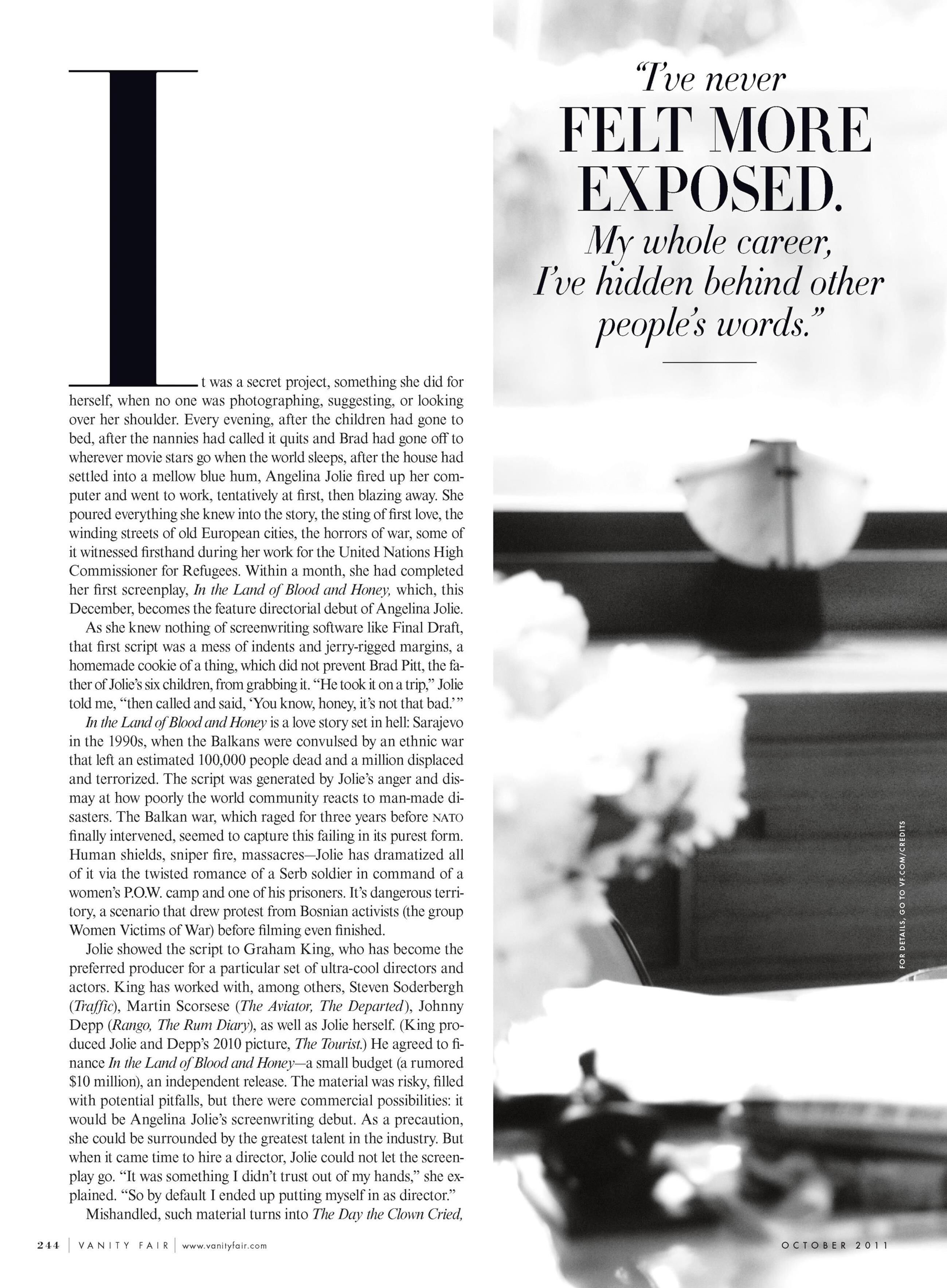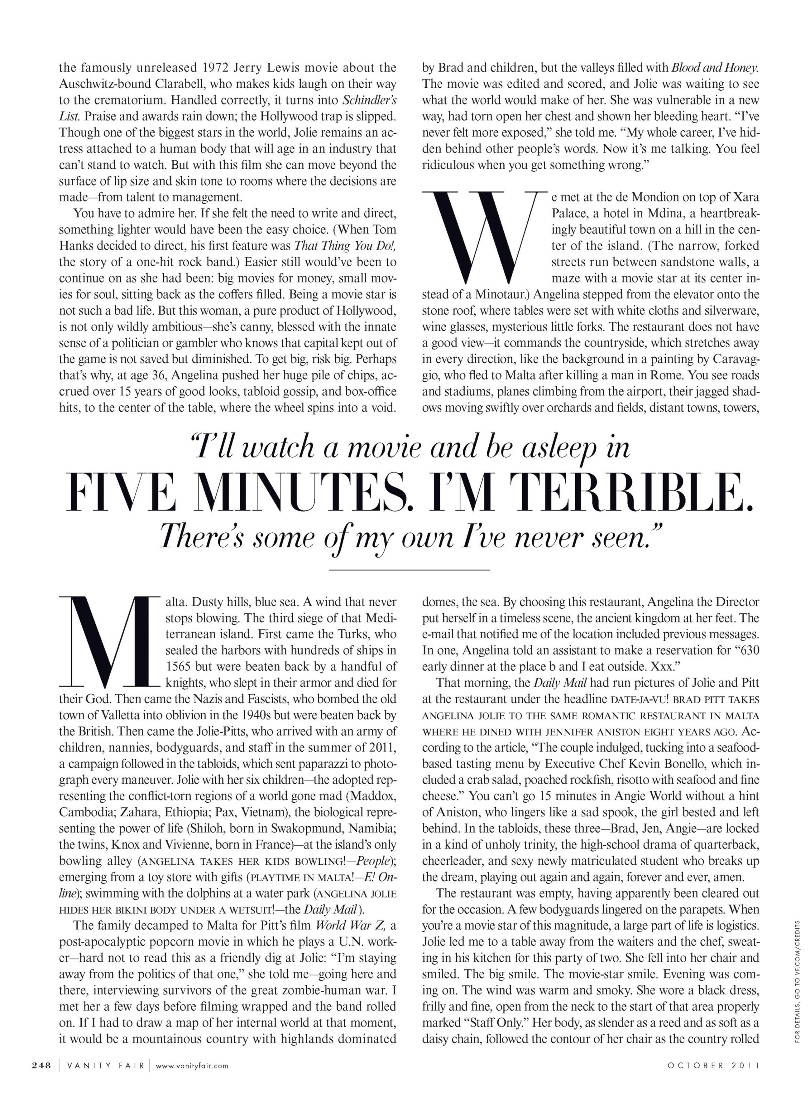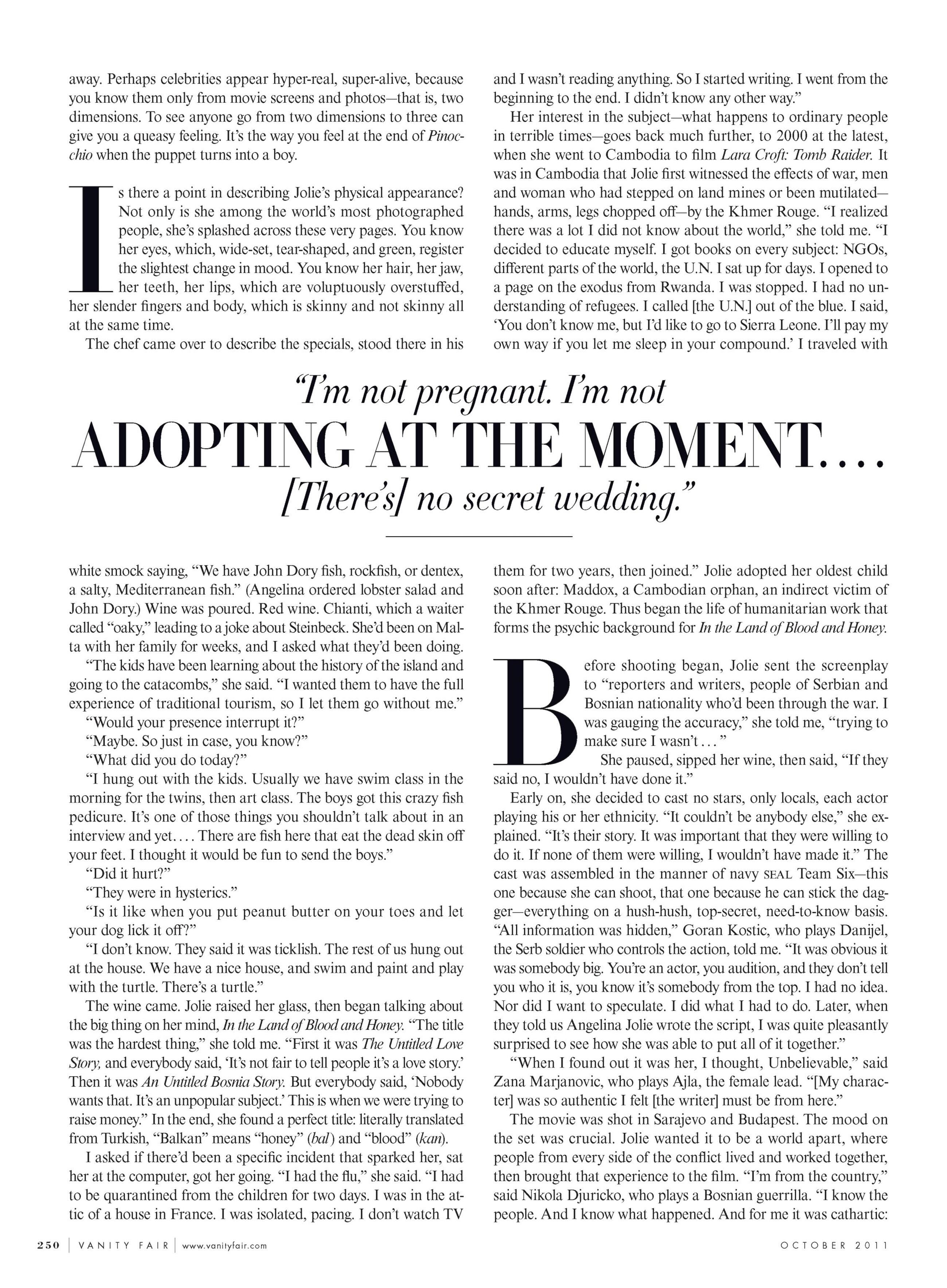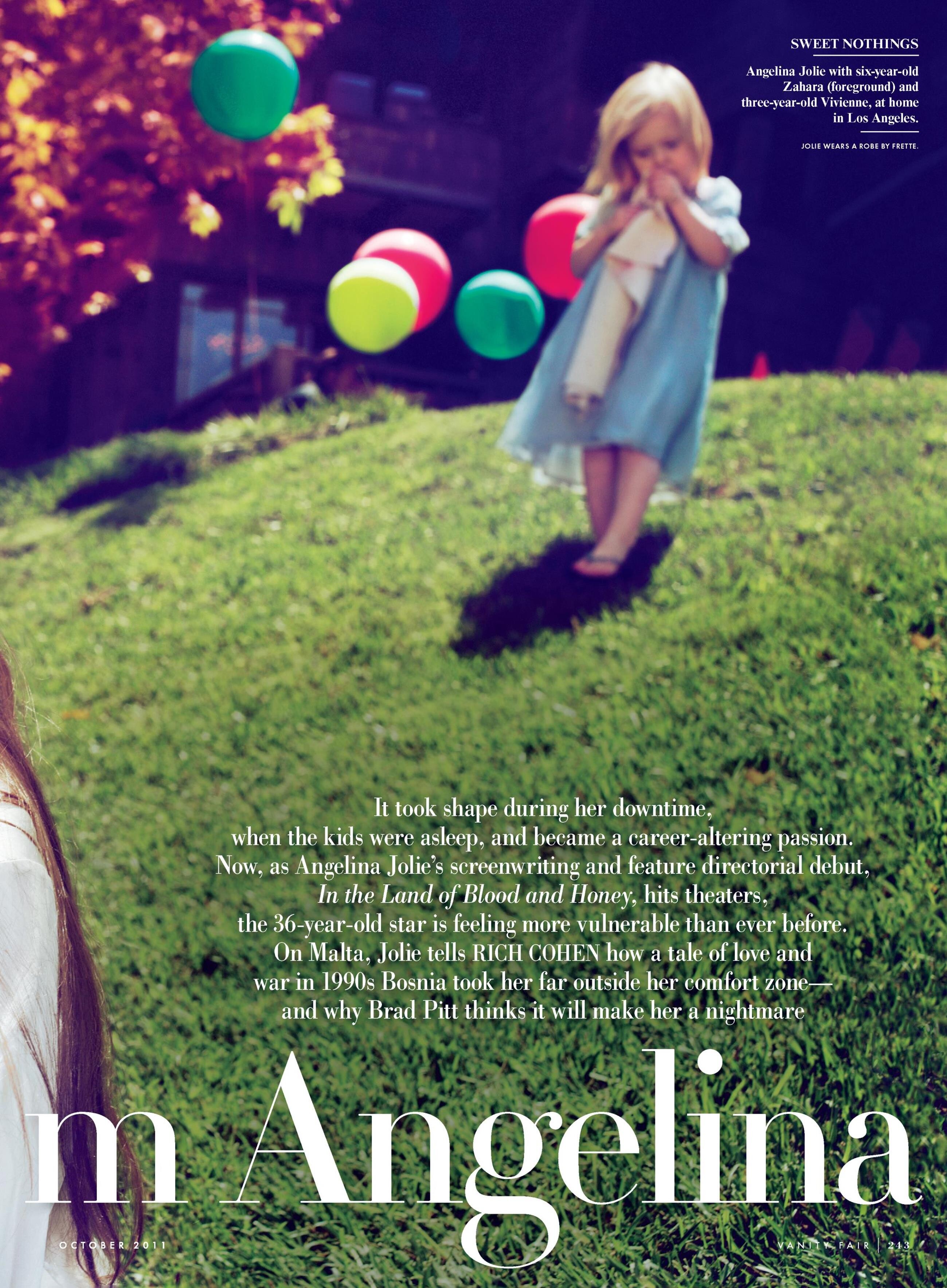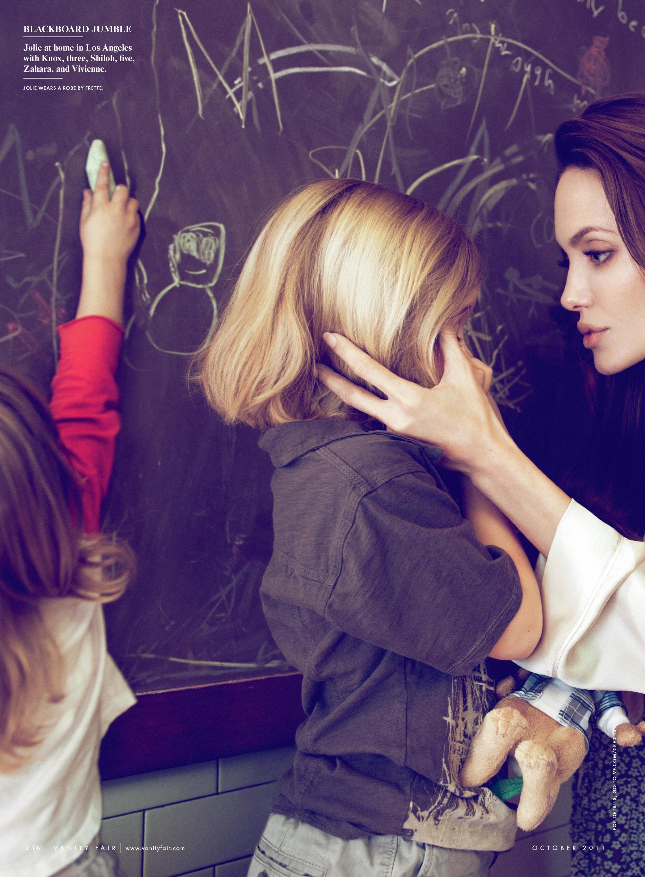 US Vanity Fair October 2011 "Direct from Angelina" Model/Subject: Angelina Jolie with her children Photographers: Mert Alas & Marcus Piggott Stylist: Jessica Diehl Hair: Colin Jamison Makeup: Toni G. Manicure: Emi Kudo Prop Stylist: Gerard Santos Vanity Fair Archive