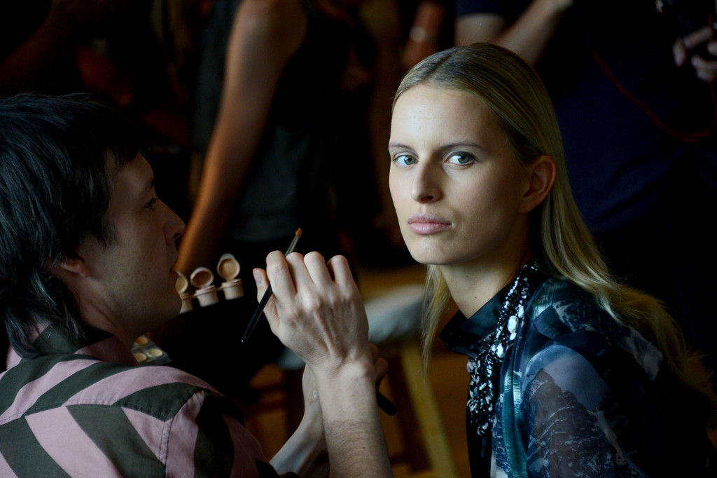 Karolina Kurkova prepares backstage at the Zac Posen Spring 2013 fashion show during Mercedes-Benz Fashion Week at Avery Fisher Hall at Lincoln Center on September 9, 2012 in New York City.
