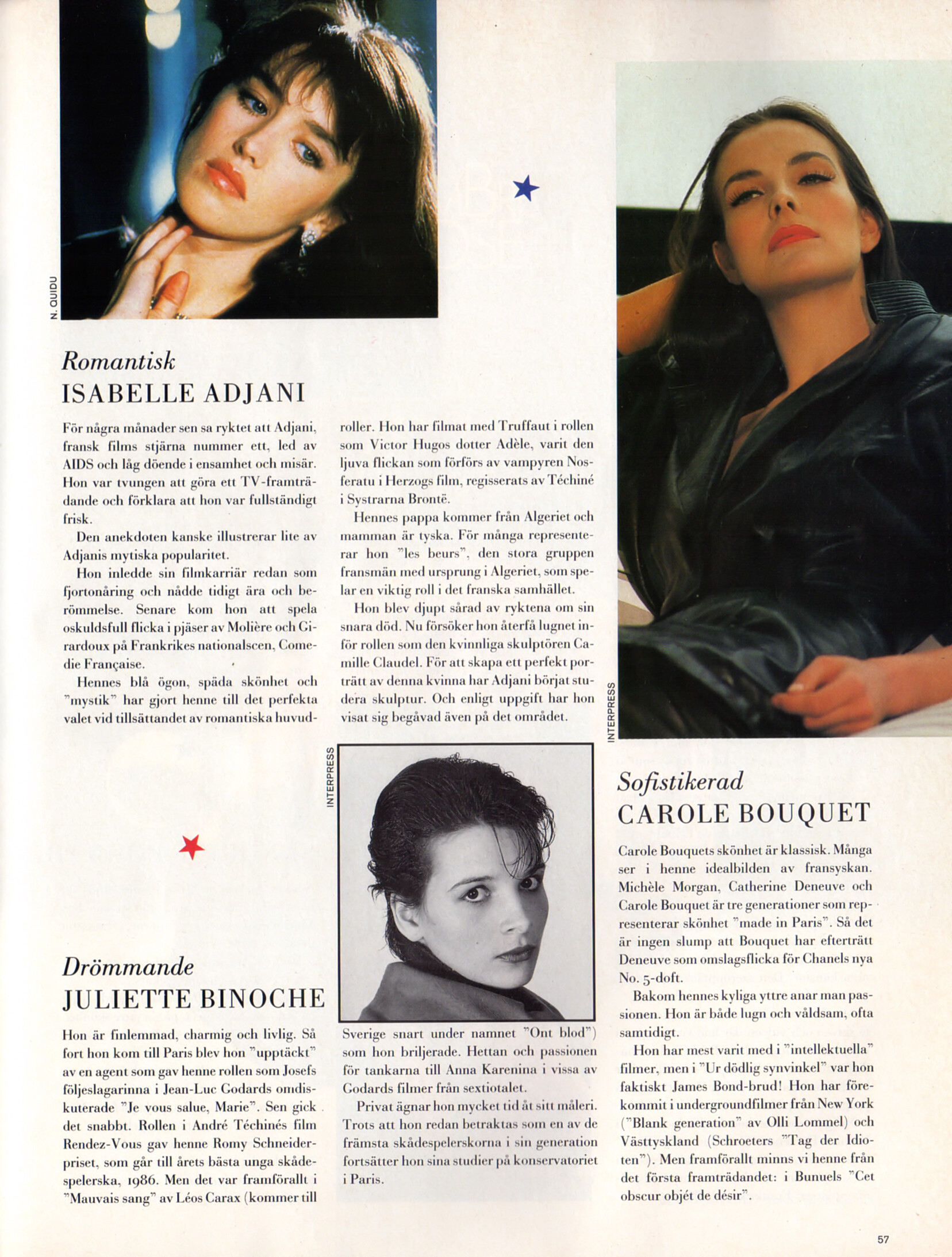 "De nya franska FILMSTJÄRNORNA" - CliC Sweden 1987 #3 - also showing Beatrice Dalle, Isabelle Adjani, Juliette Binoche, Carole Bouquet, Arielle Dombasle, Sandrine Bonnaire