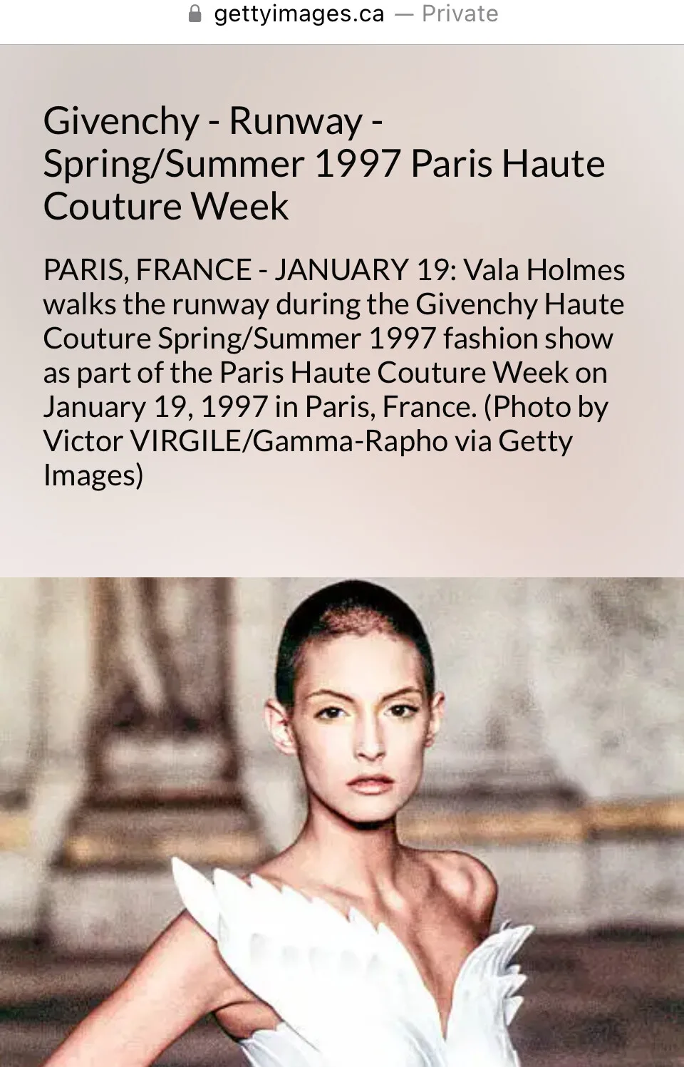 Another note for tarsier41 and argendior: I, Vala Holmes, only walked a few ready-to/wear shows with Carrie Salmon, not my various haute couture runways. Alexander McQueen had my hair shaven (to see my scar) and stencilled on my left foot scorpion fake tattoo and he markered on the fake neck blotch and bird wings on my right arm, but only randomly in 1997 to make me look fierce/tough. Some youtube videos like Givenchy Golden Fleece have the wing tattoo half sweated or swiped off. Watch like to get to know my strut. I am shorter than most models. I have given you more than I have given you more enough credited pictures from my modelling years (McQueen Dante NYC 1996 March 30 to his VOSS September 2001). I believe Carrie Salmon cut her long hair for January 1998 Victoria Secret special show, so it's very short but not a buzz cut. I don't understand why you insisted on crediting Salmon with so many of my pictures (though I understand your possible confusion up to a point.) You've actually been given the answer to a mystery from late 90s fashion. Any questions? I was well known in 1997 and 1998 especially, and with that buzz cut. People have asked what later 90s model with the hair buzz is. See what redacted pdf/pictures you find should search for my first name only in the Epstein released files. Not a pleasant experience to see yourself with three identifying markings there and posed like that, obviously not aware. Any questions?
