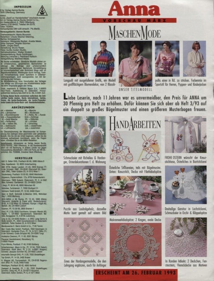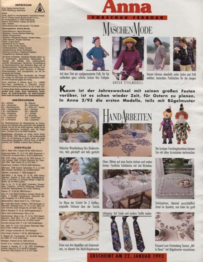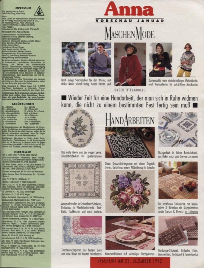 BURDA Spaß an Handarbeiten (first number in 1974,in 1981 magazine named ANNA Burda) German knitting magazine that is also published in other countries.In Russia first number in 1994-closed in 2007.