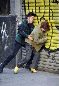on set of 'Three Generations' in Brooklyn 11/10/2014 (street fight) (an exploration of identity that centers on a New York City teen, Ray (Fanning), transitioning from female to male and her single mother, Maggie (Watts), who is coming to terms with having to raise her only daughter as a son.) Elle Fanning, Naomi Watts and Susan Sarandon have signed on to star in the film,to be released next year.- Elle Fanning