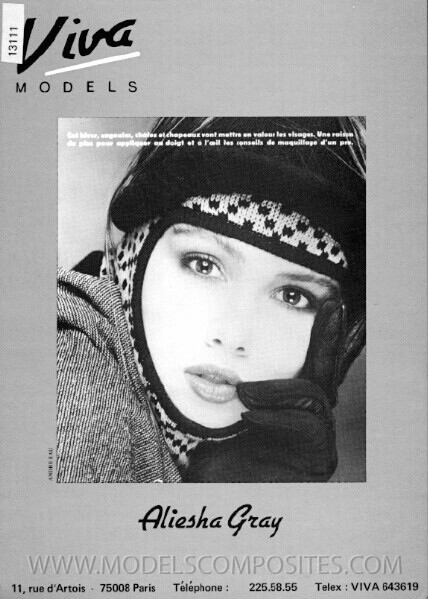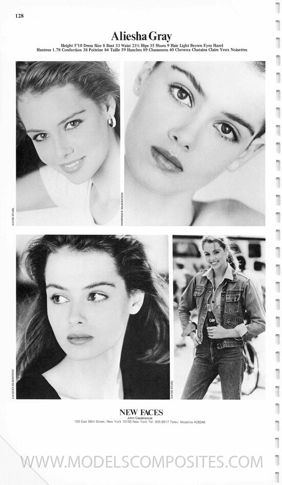 7. Aliesha Gray is an 80s/90s model represented by Elite and Viva Models. Height: 1.78 Bust: 84 Waist: 59 Hips: 89 Shoes: 40 Hair: Brown Eyes: Hazel modelcomposites.com
