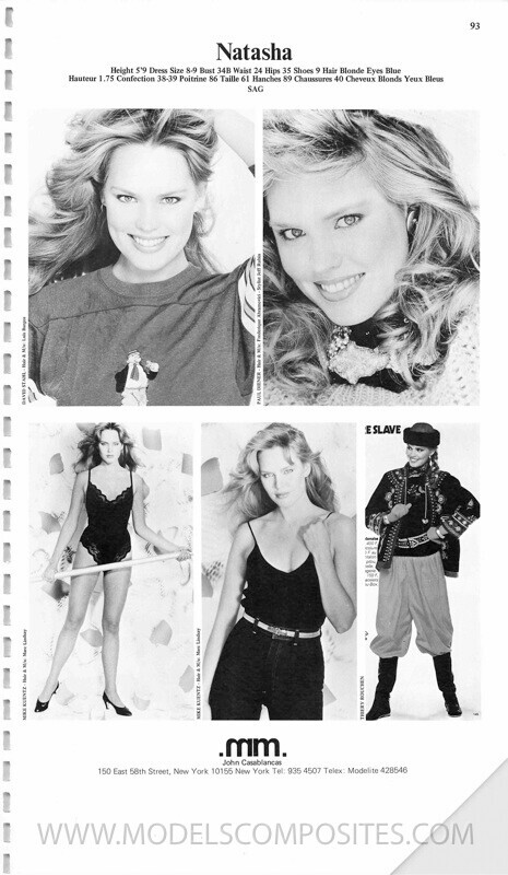 6. Natasha is an 80s model, represented by Elite. Height: 1.75 Bust: 86 Waist: 61 Hips: 89 Shoes: 40 Hair: Blonde Eyes: Blue modelcomposites.com