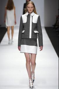 March 1, 2013 PARIS By Nicole Phelps The push/pull of masculine and feminine is shaping up to be one of this season's big stories. Vanessa Bruno cleverly inserted herself in the middle of the conversation today with a strong new collection. With its emphasis on sportswear, it seemed almost tailor-made for the U.S. market, where she announced she'll soon be opening her first permanent shop, in New York. Bruno started off with the boy stuff: Boxy pinstripe jackets and full, pleated pants matched with color-blocked shirts buttoned all the way up to their collars had a cool swagger. Same goes for the military-sharp coats, some with bold, rubberized stripes at the hems, which will be a hit in stores. Other outerwear evoked a sixties Courrèges feeling with contrast quilted leather shoulders and trim details, a mood that was echoed by skirts with oversize grommets decorating their hems. On the sweeter side of the designer's story, the spangled shift dresses—tunics, really—that closed the show were way too short. But girly has always been essential to the Bruno brand. She knows her way around a swingy little dress, and there were a couple in graphic blocks of black and white that looked great. Her pleated miniskirts, meanwhile, are another reason we'll be seeing lots of bare legs next fall. Source: style.com- Vanessa Bruno F/W 13.14 Paris