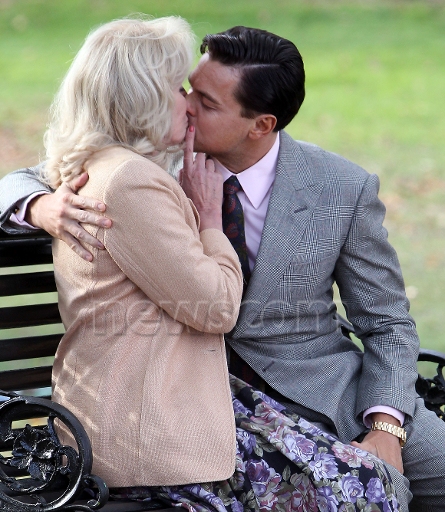 Leonardo DiCaprio and Joanna Lumley walk and kiss on a bench on set of their new movie "The Wolf of Wall Street" in Prospect Park, Brooklyn, NY on November 20, 2012. (Newscom Pictures)