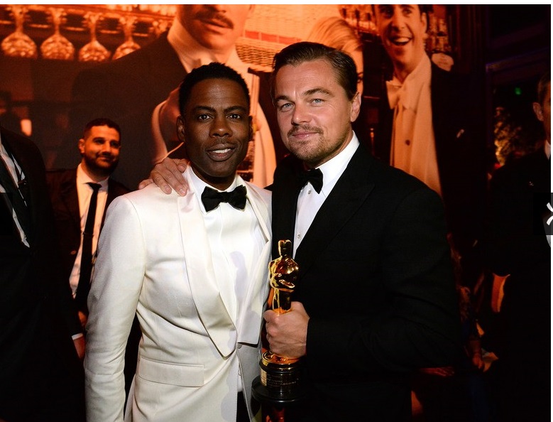 When asked if she was proud, DiCaprio’s mom Irmelin Indenbirken gushed, “I am! Thank you so much!” As Leo sipped a drink and greeted more well-wishers, Indenbirken made as much of the moment as her son proudly posing for photos with his Oscar. And when host Chris Rock came over to congratulate Leo, it was Indenbirken who took the photo of the host with the newly-minted Oscar winner. Rock joked that he liked DiCaprio’s extra security and would be sticking close. The pair proceeded to hold court as the entire focus of the room shifted to spin around a triumphant Leo.