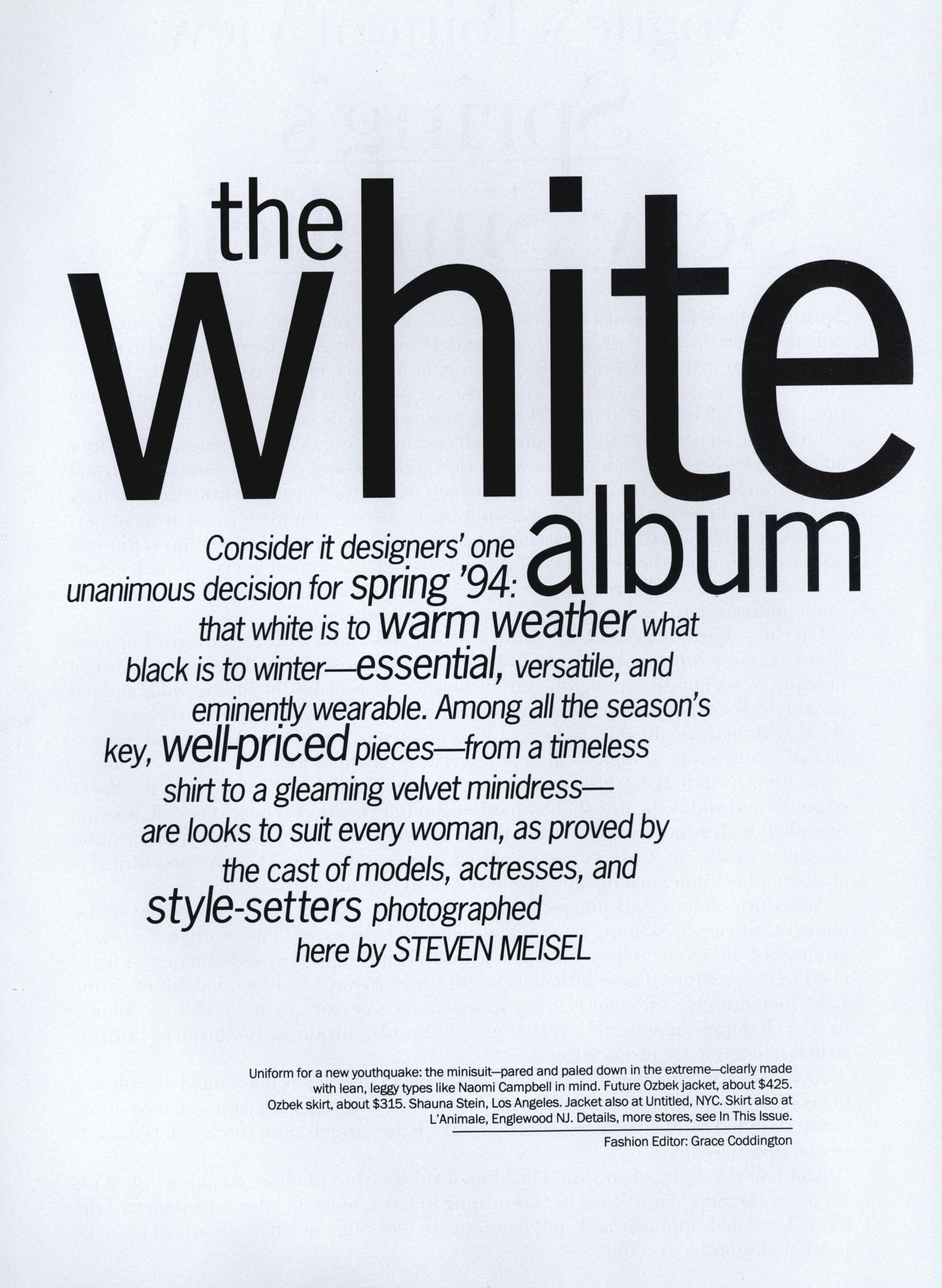 February 12, 20214 yr US Vogue April 1994 "The White Album" Models & Subjects: Naomi Campbell, Cindy Crawford, Claudia Schiffer, David Copperfield, Bridget Hall, Beverly Peele, Suzy Amis, Plum Sykes, Martha Plimpton, Cynthia Carter, Reese Witherspoon, Ellen von Unwerth, Marina Rust, Linda Evangelista, Paulina Porizkova, Ric Ocasek, Veronica Webb, Isabella Rossellini, Michele Hicks, Halle Berry, Ashley Judd, Poppy Lloyd & Sarah Jessica Parker Photographer: Steven Meisel Fashion Editor: Grace Coddington Hair: Ward Stegerhoek (Naomi, Cindy, Bridget & Ellen) & Garren (all the others) Makeup: Denise Markey WARNING: See through topless (13th page) archive.vogue.com