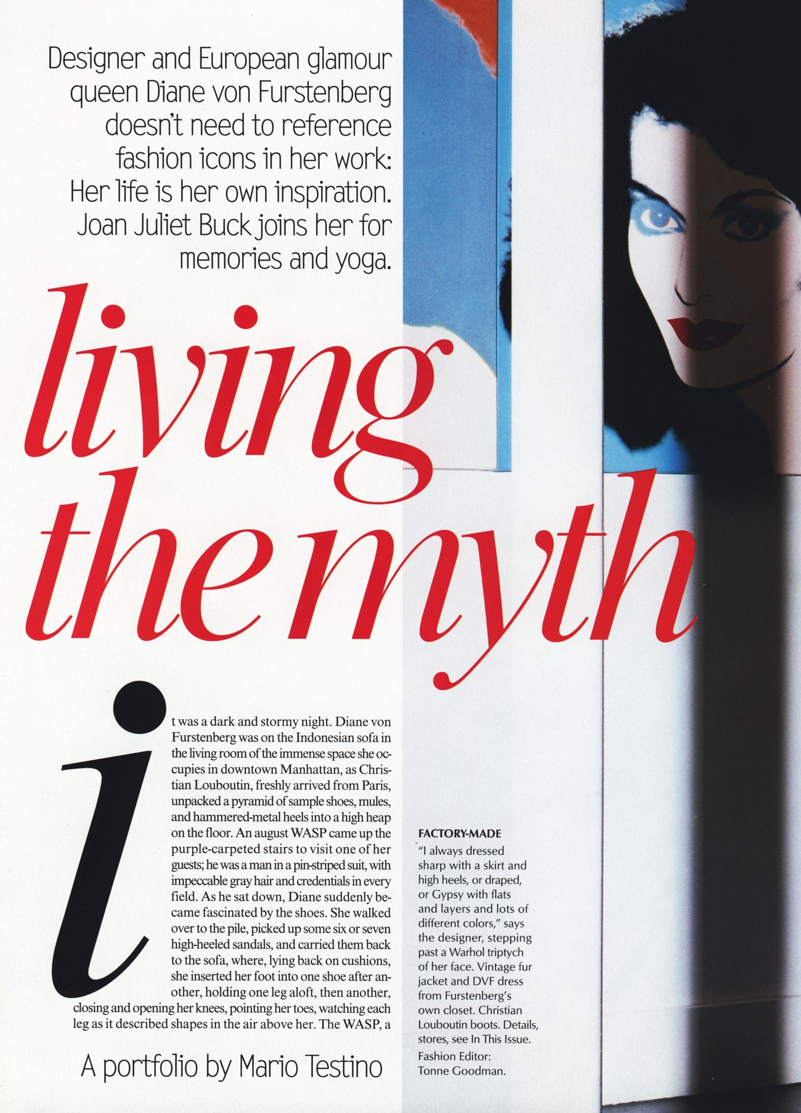 December 31, 20205 yr US Vogue August 2003 "Living the Myth" Model/Designer: Diane von Furstenberg Photographer: Mario Testino Fashion Editor: Tonne Goodman Hair: Orlando Pita Makeup: James Kaliardos archive.vogue.com