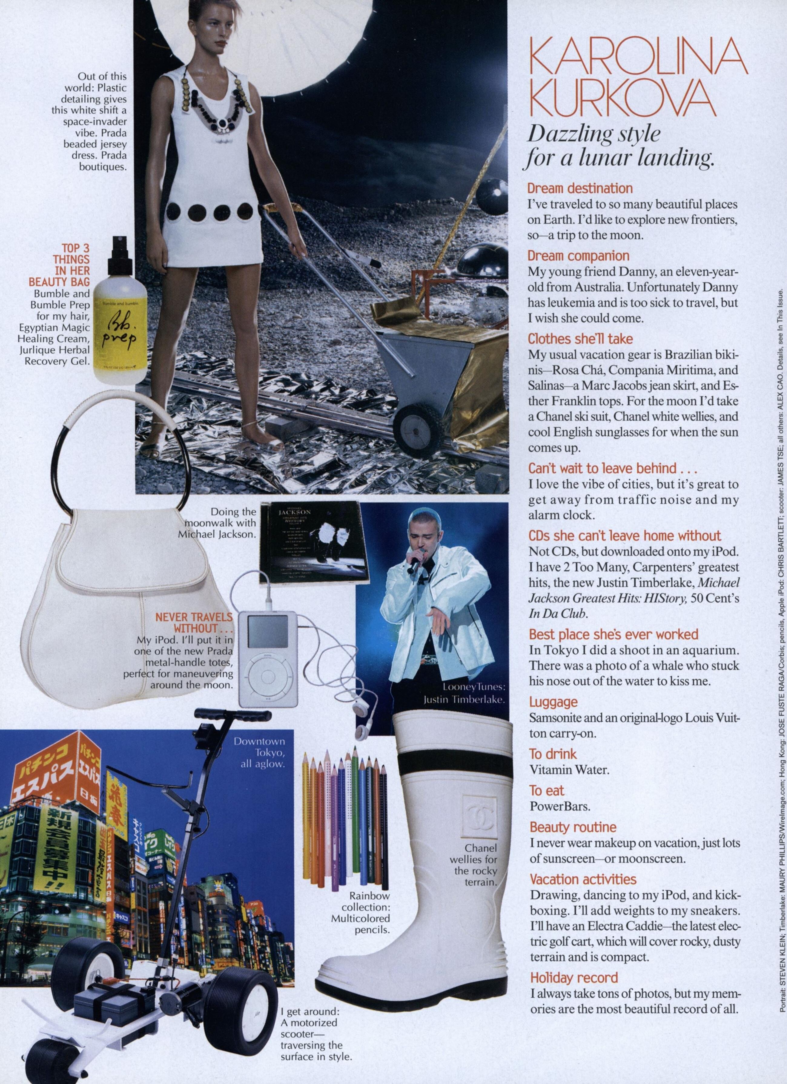December 30, 20205 yr Author US Vogue June 2003 "Supermodel Summer: Space Oddity" Model: Karolina Kurková Photographer: Steven Klein Fashion Editor: Grace Coddington Hair: Oribe Canales Makeup: Gucci Westman Set Designer: Mary Howard archive.vogue.com