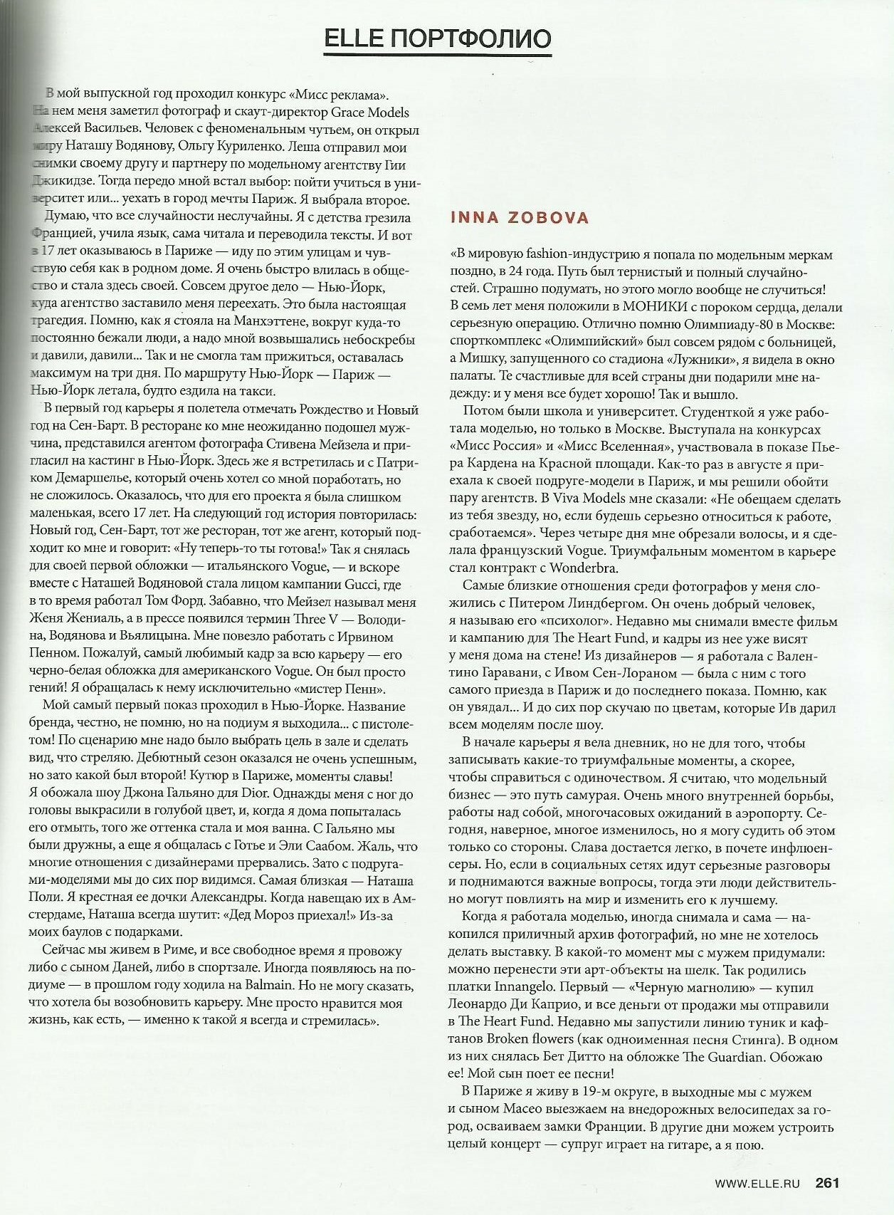 March 12, 20196 yr ELLE Russia October 2018 Good news!Russian top models 90's & 2000's Eugenia Volodina,Inna Zobova,Natalia Semanova,Sisters Lida & Alexandra Egorova,Tatiana Zavialova,Irina Pantaeva and Angelica Boss remember their modeling career and talk about their current life. ( Scanned by me) ''I still miss the flowers Yves Saint Laurent gave after the fashion show'' Inna Zobova She started a world model carrer in 24 age in Paris (Viva models agency) Now she lives with her husband and son in Paris (19th district).