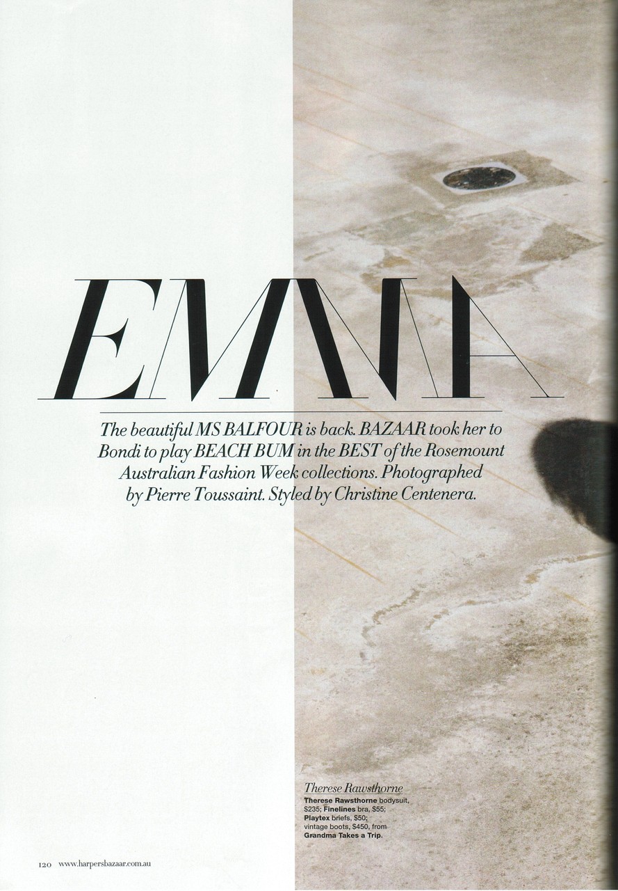 February 24, 201015 yr First Name: Emma Last Name: Balfour Nationality: British (English) Hair Color: Blonde Eye Color: Blue Date of Birth: April 8, 1979 Place of Birth: Hastings, East Sussex, England Height: 5'9" ; 175cm Measurements: (US) 34-24-34 ; (EU) 86.5-61-86.5 Dress Size: (US) 4 ; (EU) 34 Shoe Size: (US) 8.5 ; (EU) 39 ; (UK) 6 Mother agency: unknown Agencies: * Elite Model Management - New York * Storm Models - London * D Management Group * City Models - Paris * New York Model Management * Priscillas Model Management * L.A. Models Advertisements: Calvin Klein, Christian Dior, DKNY, Gap, Georgio Armani, Hugo Boss, IBlues, Jil Sander, Kenzo, Lee Jeans, Mango, Russell & Bromley, Saba, Woolmark, Magazine Covers: Australia: 'The Mag' - July 1997; 'Elle' - June 1998, 'Oyster' - December/January 1998 France: 'Marie Claire' - August 1989; 'Elle' - October 7 1996 Italy: 'D' - May 28 1996; 'D' - September 23 1997; 'D' - November 18 1997; 'D' - March 17 1998 UK: 'Elle' - April 1990; 'i-D' - November 1995; US: 'Mademoiselle' - July 1989; 'Mademoiselle' - March 1993 Fashion Shows: Ready to wear - Spring/Summer 1994 {Chanel, Martine Sitbon} Ready to wear - Spring/Summer 1995 {Chloé} Ready to wear - Autumn/Winter 1997 {Ann Demeulemeester, Anna Sui, Antonio Berardi, Balenciaga, Bella Freud, Calvin Klein, Cerruti 1881, Chloé, Clements Ribeiro, Costume National, DKNY, Donna Karan, Dries van Noten, Hussein Chalayan, Jean Colonna, John Rocha, Lanvin, Marc Jacobs, Martine Sitbon, Nicole Farhi, Paco Rabanne, Philip Treacy, Richard Tyler, Richard Tyler Collections, Sonia Rykiel, Todd Oldham, Versus} Ready to wear - Spring/Summer 1998 {Antonio Berardi, Ann Demeulemeester, Calvin Klein, Costume National, Chloé, Donna Karan, Dries van Noten, DKNY, Emanuel Ungaro, Hussein Chalayan, Jean Colonna, Julien MacDonald, John Rocha, Marc Jacobs, Martine Sitbon, Paco Rabanne, Rifat Ozbek, Richard Tyler, Richard Tyler Collections, Sonia Rykiel, Versus} Ready to wear - Spring/Summer 2009 {Alexander Wang, Giles, Marc Jacobs} Hobbies: Horseback riding, writing poetry Notes: - Emma started modelling in Sydney, Australia when she was 17 years old. Her mother was an acrobat with 'Circus Oz' and some of Emma's childhood was spent travelling with the circus performers. She learned to unicycle, juggle and walk the tightrope. Her modelling career didn't really take off until she moved to London and was signed by the Storm agency.