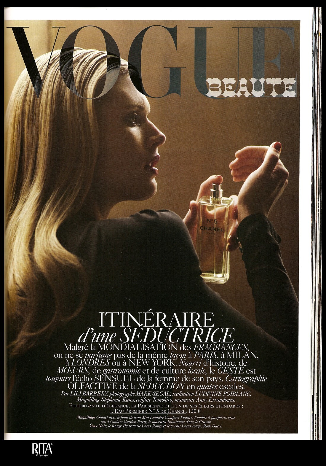 April 6, 20205 yr Vogue Paris December 2007/January 2008 "Héroïne Noctutne" Model: Vlada Roslyakova Photographer: Mark Segal Stylist: Julia van Boehm Hair: Laurent Philippon Makeup: Aaron de Mey Manicure: Gina Viviano Scanned by Diorette @ tfs