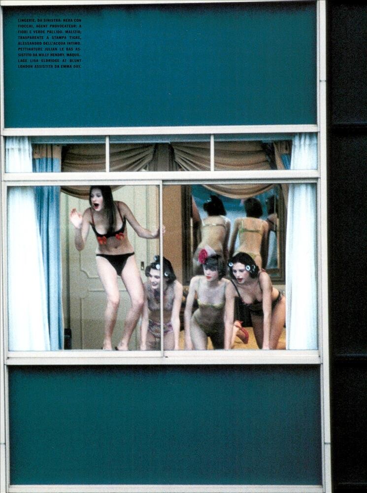 February 8, 20205 yr Magazine: Vogue Italia (February 2001) Title: The Vagaries of Fashion Photographer: Ellen von Unwerth Model(s): Lisa Ratliffe, Sara Daykin, Janelle Fishman, (Mia Hessner-Sovensky?) & utm Vogue Italia Archivio