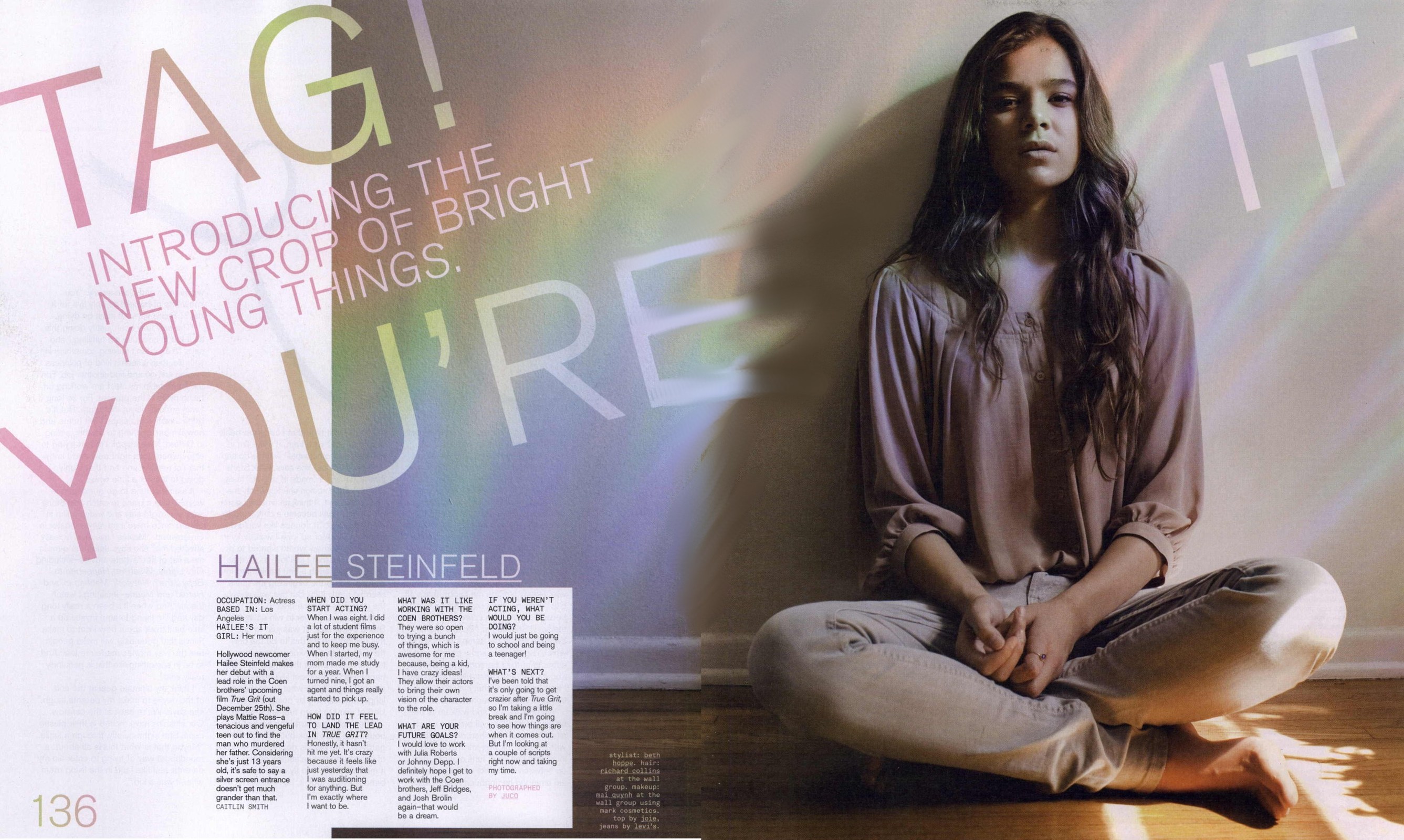December 23, 201015 yr Author "New Grit" Vanity Fair January 2011 Photographer: Sam Jones Source: h-steinfeld.com Waiting on a Paramount lot dressed in Salvation Army clothes and a skirt her mother had made, Los Angeles native Hailee Steinfeld was in full character as Mattie Ross, the determined young heroine of the classic 1969 Western True Grit, which is getting a re-do from Joel and Ethan Coen (Fargo, No Country for Old Men). Steinfeld, a child model, beat out nearly 15,000 girls for her first major role, opposite Jeff Bridges as the reluctant hero Rooster Cogburn (the part that won John Wayne his only Oscar), Matt Damon as his rival, and Josh Brolin as the heavy. “Just watching them taught me a lot,” says Steinfeld, who turns 14 this month. “I learned more from their actions than from their words.” Her on-set education was not entirely age-appropriate, however—she learned not only how to fire a gun but also how to hand-roll a cigarette. “Jeff gave me this little tip on how to make it easier, and I would go home and just constantly roll cigarettes all night.” How did being in a major movie affect the routines of teenage life for Steinfeld? For one thing, it meant no texting. “We were in a very remote location and I never got service,” she says. “It was kind of a bummer, but it made me focus more on school.” What is it like seeing herself on-screen? “I ask other actors that question, and they always say, ‘I'm not watching myself; I'm watching someone else.’ So I try to watch myself like that, but it's weird. I think it's something I have to get used to.” Source: vanityfair.com