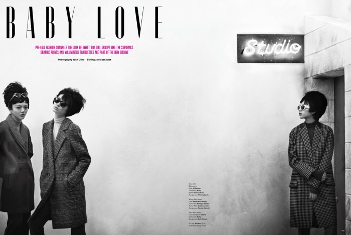 October 25, 201114 yr Has Josh Olins formed the perfect girl group for V Magazine? Wang Xiao, Rila Fukushima and Xiao Wen Ju, look absolutely lovely playing a modern day version of the 1960s supergroups like The Supremes and Shirelles in this cheeky story from V72. Dressed in pre-fall’s grooviest pieces from Stella McCartney, Balenciaga and Celine – selected by stylist Jay Massacret, the girls look like they’ve got the whole retro thing down pat. Maki Ryoke and Shon provide the ladies with the prerequisite winged liner and bouffant hairstyles, but the attitude is all their own. If these girls can carry a tune, the music world better watch out! V72 – The Transformation Issue, hits newsstands July 7th from models.com