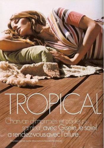 December 30, 200817 yr OK I checked Gisele's official website and apparently, it's from French Elle 14 February 2005. This was the cover (from herfamedgoodlooks): She had 4 editorials in this issue : Diva Africa by Jean Baptiste Mondino Tropical girl by Carter Smith Hippie Lady by Jan Welters Flower Princess by Stéphane Sednaoui