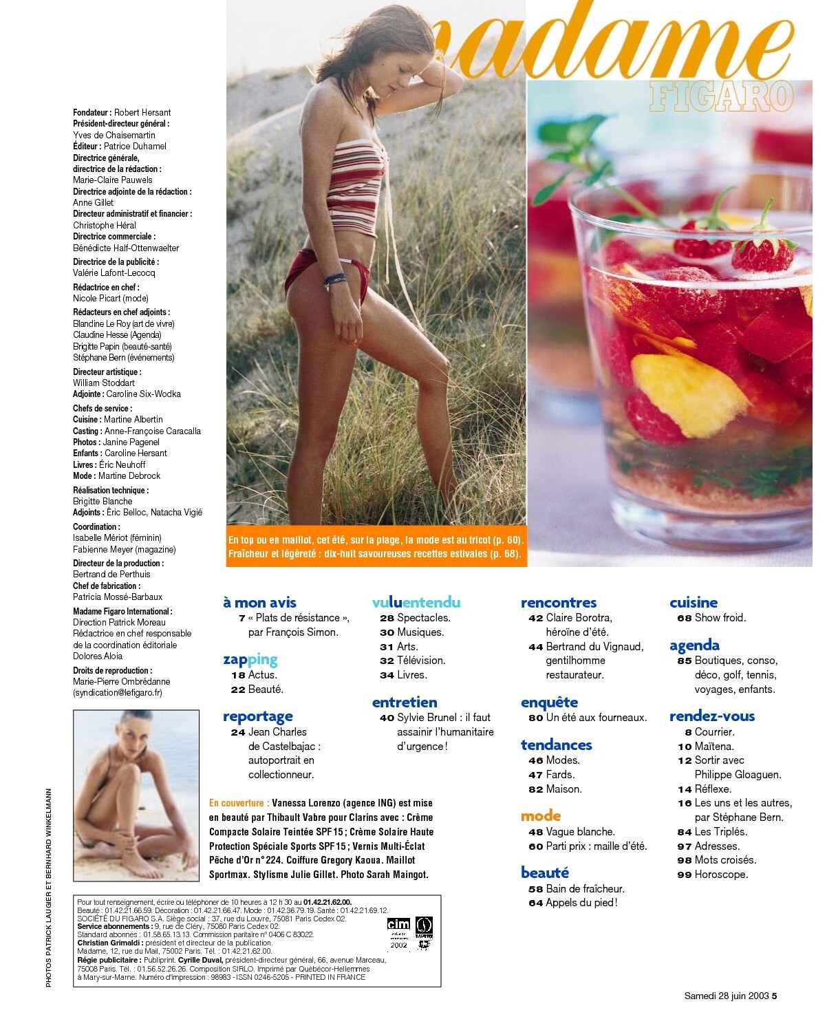 October 18, 20196 yr Madame Figaro (France) - June 28, 2003 Cover: Vanessa Lorenzo by Sarah Maingot Vague blanche Marie Bartosova by Sarah Maingot Bain de fraîcheur Marie Bartosova, ? by Sarah Maingot Maille d'été ? by Patrick Laugier Appels du pied! Vanessa Lorenzo by Sarah Maingot