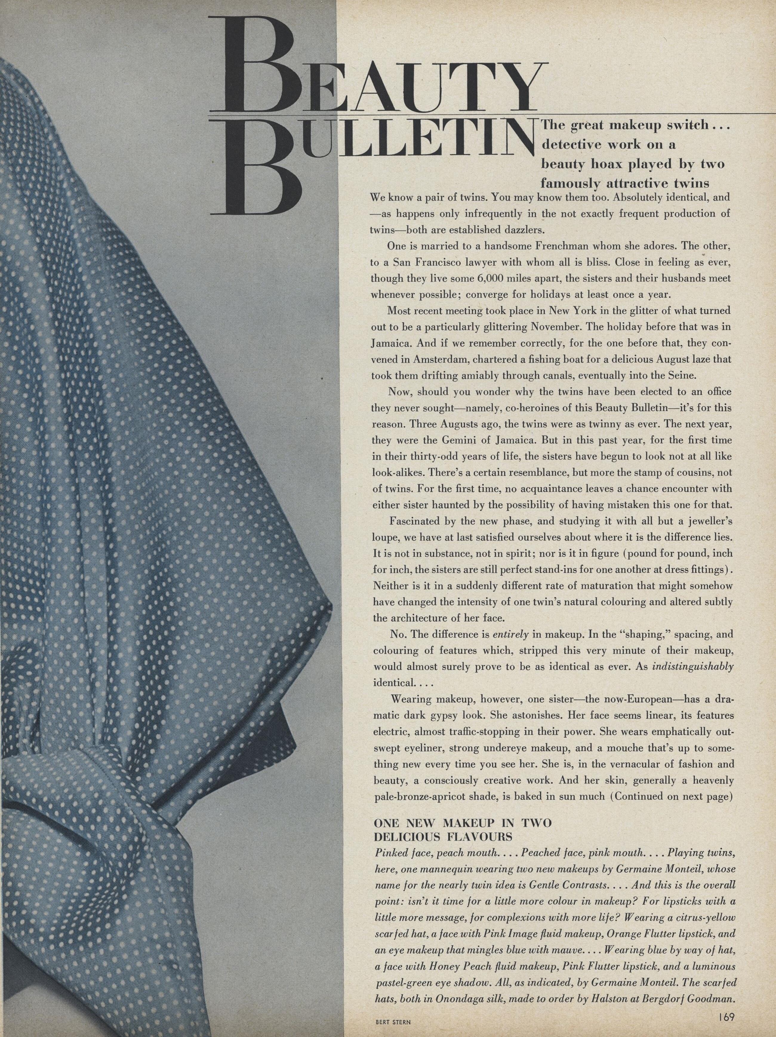 October 31, 20205 yr Author US Vogue March 1st, 1965 "Beauty Bulletin" Models: Brigitte Bauer, Benedetta Barzini & Unknown Photographer: Bert Stern archive.vogue.com