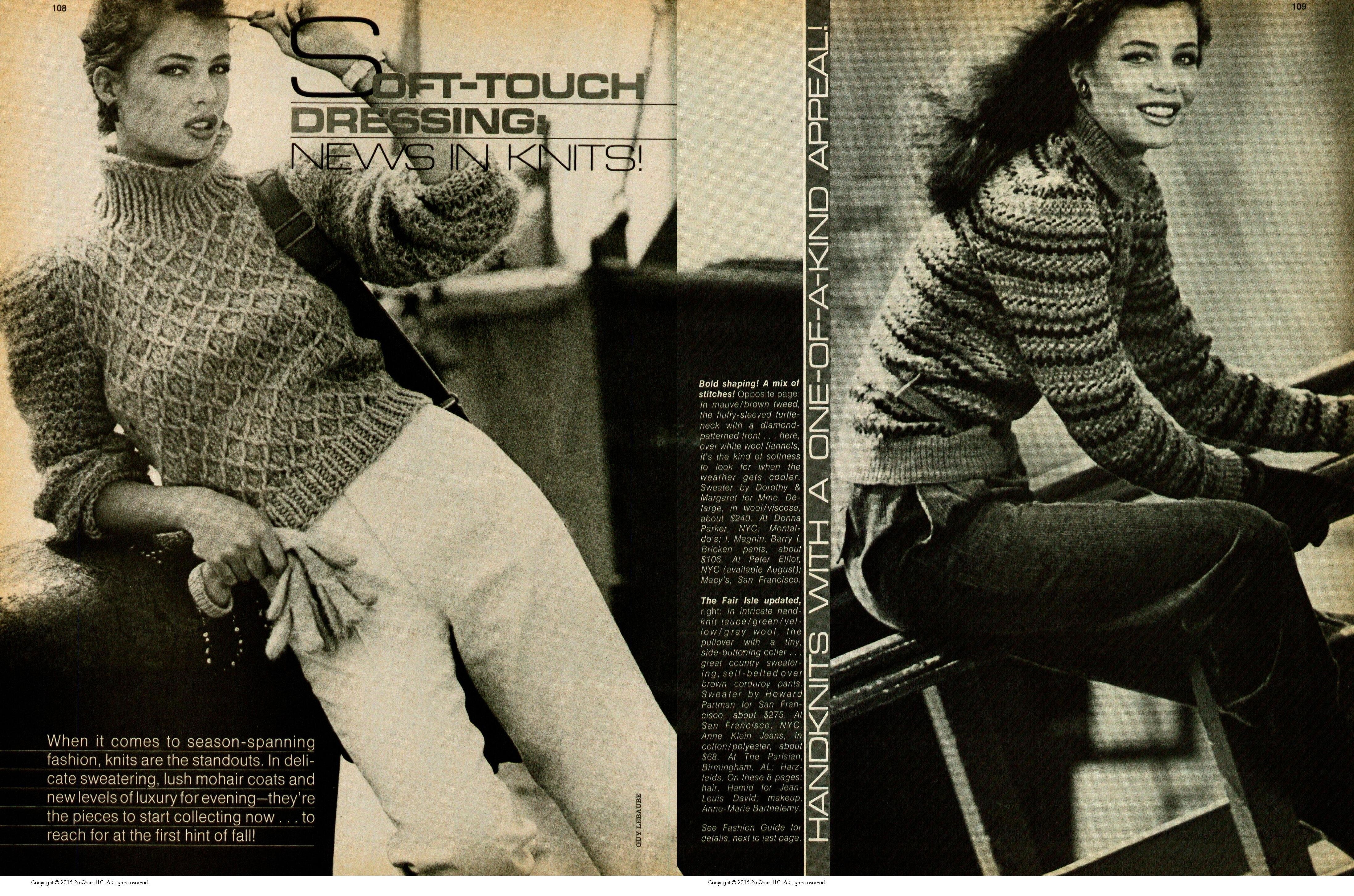 October 14, 20241 yr Author US Harper's Bazaar August 1980 "The Bazaar Touch: Great Sweaters! Great Prices!" Model: Unknown Photographer: Guy Le Baube Hair & Makeup: Mark Sephton Harper's Bazaar Archive via blueorchid at The Fashion Spot